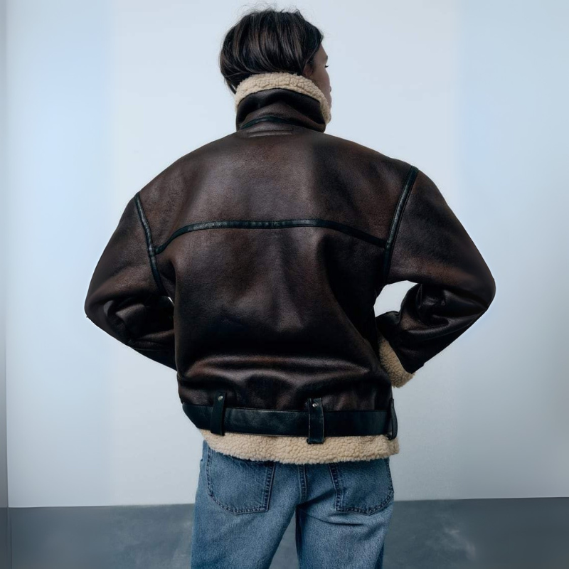 This women’s jacket features a classic aviator-inspired design with a wide lapel collar lined in faux shearling. Crafted in a dark leather-look finish, it is detailed with contrasting cream lining visible at the collar, cuffs, and hem. The front zip closure and structured cut give it a refined yet casual edge.
